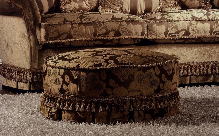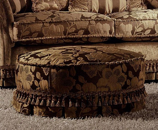 Круглый пуф в классическом стиле. Структура пуфа - бук и тополь. В качестве наполнения представлен полиуретан. Обивка может быть выполнена в нескольких вариантах, в том числе из ткани заказчика.