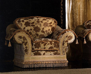 Кресло в классическом стиле. В качестве наполнения использован полиуретан. Отделка и обивка могут быть представлены в нескольких вариантах, в том числе может быть выполнена из ткани заказчика. Можно заказать сменную обивку