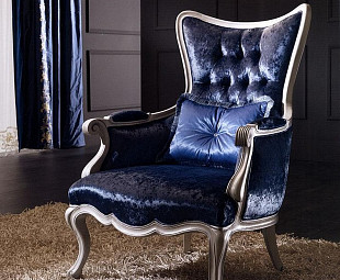 Кресло, изготовленное из бука, с наполнителем из полиуретана и с декором в виде резьбы. Есть несколько вариантов отделки: со старением, капитоне и другие. Также можно выбрать обивочную ткань из представленных на сайте, или предоставить свой вариант.