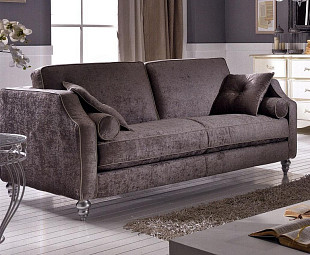 Диван для двух персон с декоративными ножками. Изготовлен из массива тополя, наполнен полиуретаном. Возможны различные варианты отделки и обивки, в том числе выполнение в ткани клиента. Дополнительно возможно заказать сменную обивку