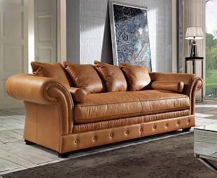 Классический трехместный диван-кровать, с основанием обитым в технике капитоне. Обивка и отделка могут быть представлена в других вариантах, в том числе в ткани клиента.