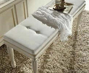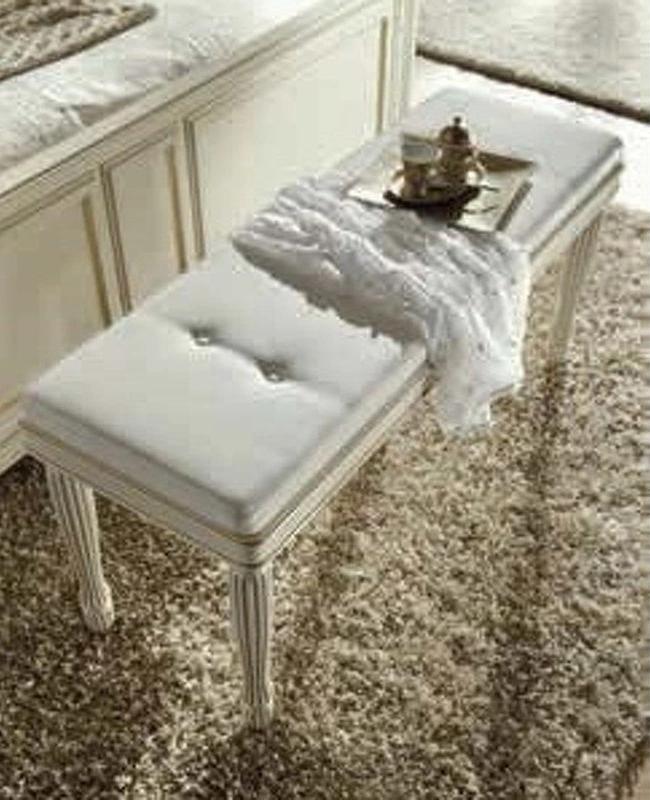Банкетка с изящными фигурными ножками выполнена в классическом стиле. Сиденье обито тканью и украшено стежкой.