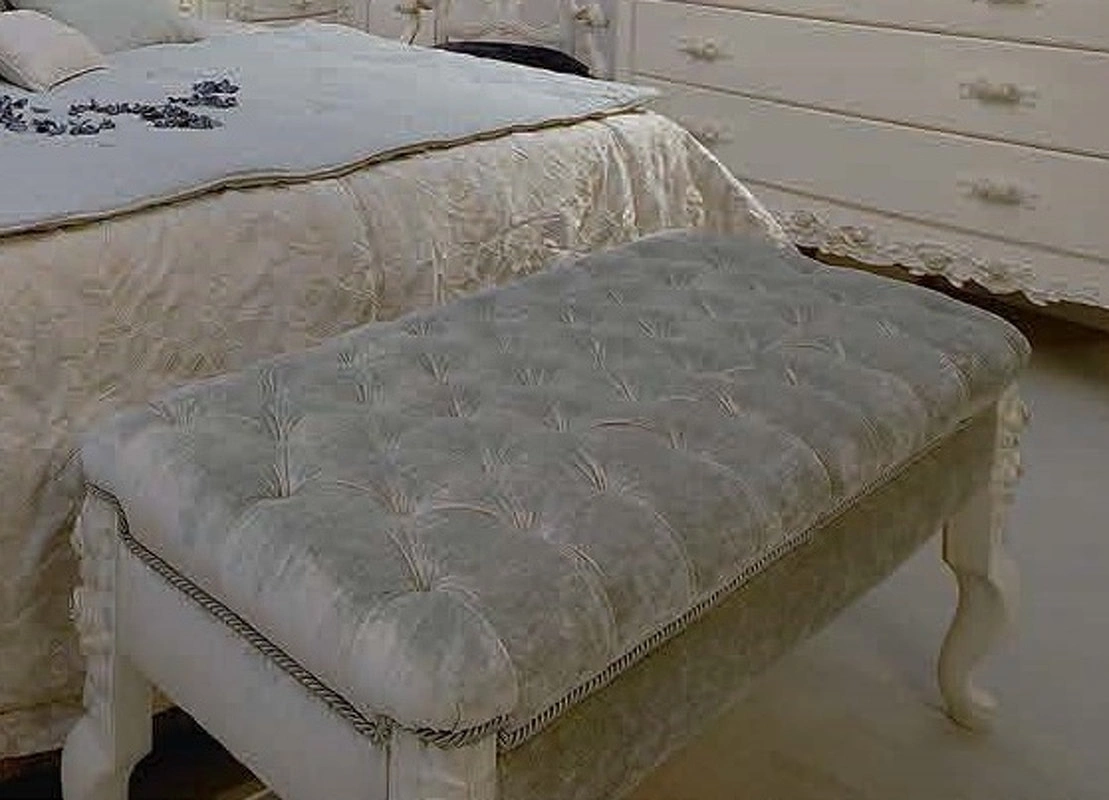 Банкетка с изогнутыми ножками выполнена в ар-деко. Она декорирована резьбой, стежкой капитоне и шнуром.