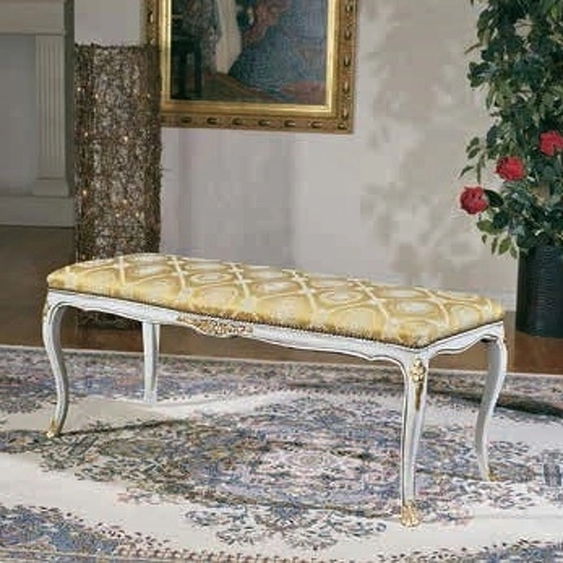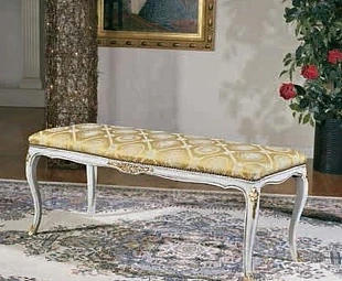 Банкетка с изогнутыми ножками выполнена в классическом стиле. Она украшена резьбой, а сиденье обтянуто тканью.