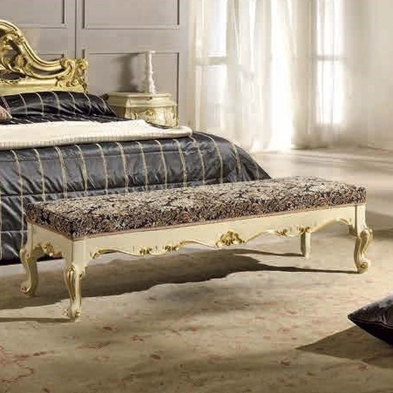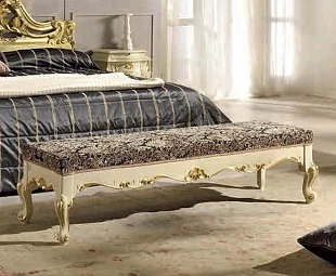 Банкетка на изогнутых ножках выполнена в классическом стиле и украшена резьбой.