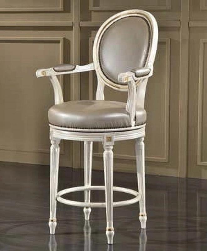 Барный стул с медальонной спинкой и подлокотниками выполнен в классическом стиле. Круглое сиденье и спинка обиты кожей, а резные элементы подчеркивают уникальность модели.