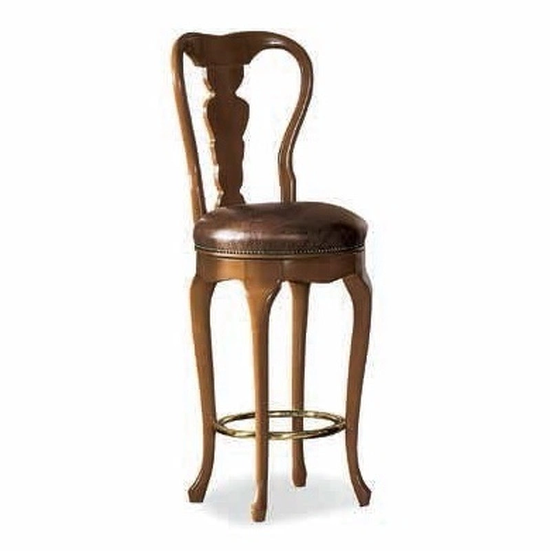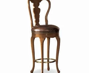 Барный стул с резной спинкой выполнен в классическом стиле. Круглое сиденье обито кожей и украшено мебельными гвоздиками.