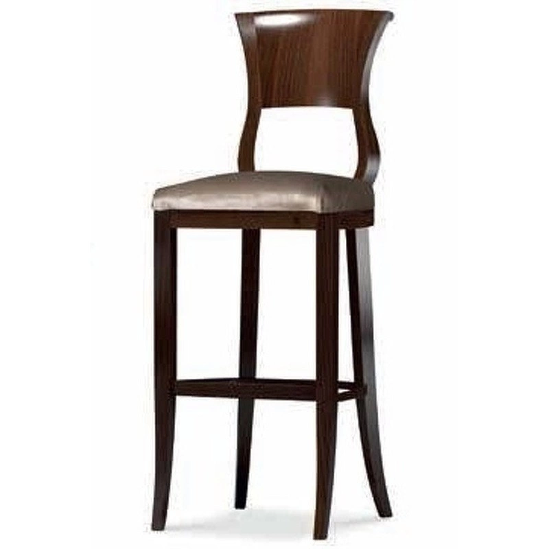 Барный стул с изогнутыми ножками выполнен в классическом стиле. Сиденье обито тканью. Оригинальность модели подчеркивает фигурная деревянная спинка.