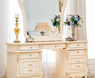 Туалетный столик Катрин. Столик выполнен в классическом стиле и украшен ручной лепкой. Столик имеет девять выдвижных ящиков для хранения. Столик сделан из МДФ в матовом покрытии и в отделке молочно-белого цвета. Роскошный столик дополнит интерьер вашего дома.