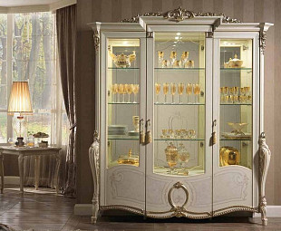Большая витрина Tiziano фабрики Arredo Classic. Витрина сделана из высококачественного МДФ и ДСП. Витрина выполнена в цвете матовой слоновой кости с добавлением золотых элементов. Витрина имеет три двери.