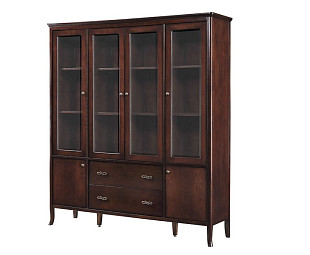 Большой книжный шкаф Carpenter 309 орехового оттенка производится мебельной фабрикой из массива березы. Верхняя часть разделена на четыре отделения с полками и закрыта четырьмя распашными дверцами со стеклянными вставками. В нижней части сделаны выдвижные ящики и отделения для хранения.