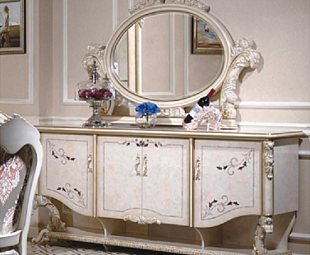 Большой комод в гостиную коллекции Наполеон, производство Китая, светлого цвета украсит Вашу гостиную своим оригинальным дизайном. Круглое зеркало, поддерживаемое подставками - удачный дизайнерский ход в оформление интерьера. Двери ящиков украшены неброским растительным рисунком, придающего обстановке элегантный штрих.