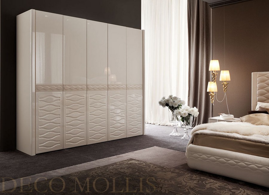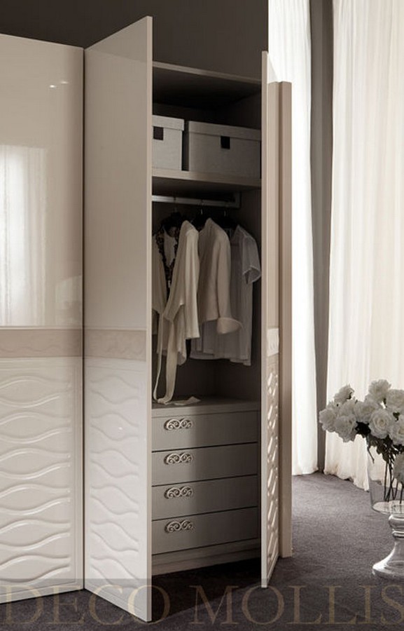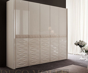 Элегантный шкаф, выполненный в стиле модерн, в котором присутствует современный стиль и классические формы. Нежные светлые тона прекрасно сочетаются с яркими элементами мягкой мебели, выполненными в синей ткани под замшу. Мебель и отделка сделаны исключительно из высококачественных материалов. Нестандартная форма мебели подчеркивает и придает индивидуальность всему интерьеру спальни. Роскошный итальянский шкаф дополнит интерьер любого самого изысканного дома.