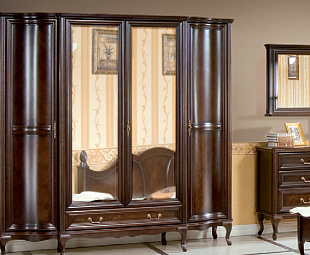 Классическая модель с четырьмя распашными дверями и зеркальной частью по центру. Удобная и практичная мебель для хранения одежды и белья.
