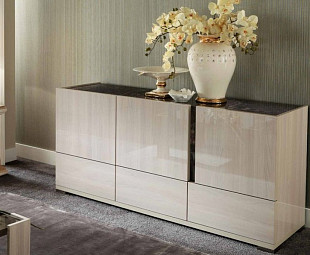 Буфет для посуды в гостиную Teodora станет отличным дополнением к дизайну в стиле модерн. Эффектные глянцевые фасады и отделка шпоном дерева Кото в цвете "Светлый вяз" привнесут элегантности и легкости, а вместительные полки и выдвижной ящик помогут грамотно распределить вещи.