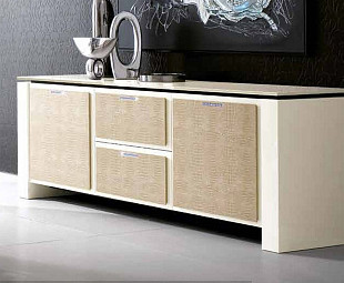 Буфет для столовой Diamond. Материальные оттенки цветов и гармония объемов характеризуют данную коллекцию, в которой растворяются функциональные элементы, как главную роль изысканного вкуса. Буфет Diamond выполнен в стиле модерн в которой преобладают существенные решения в игре пустых и полных пространств, чередование отделки из бежевой кожи крокодила и глянцевых поверхностей. Буфет Diamond выполнен в цвете слоновая кость. Сделан буфет из высококачественного МДФ с дополнением эко кожи. Буфет Diamond с современным дизайном придаст интерьеру вашего дома изысканность и безмятежный комфорт.