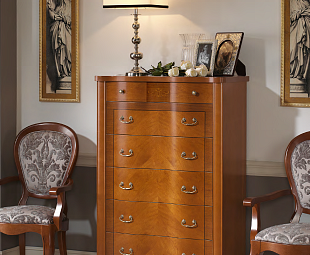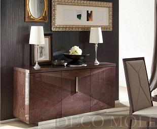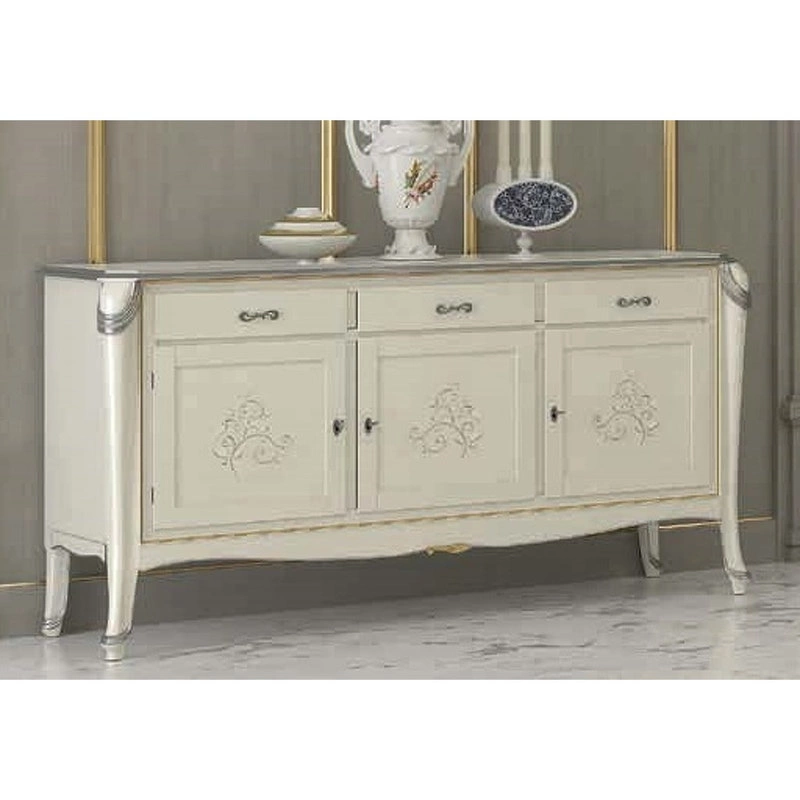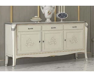 Буфет выполнен в классическом стиле и оснащён тремя ящиками и тремя дверцами с декором. Резные элементы подчеркивают оригинальность модели.