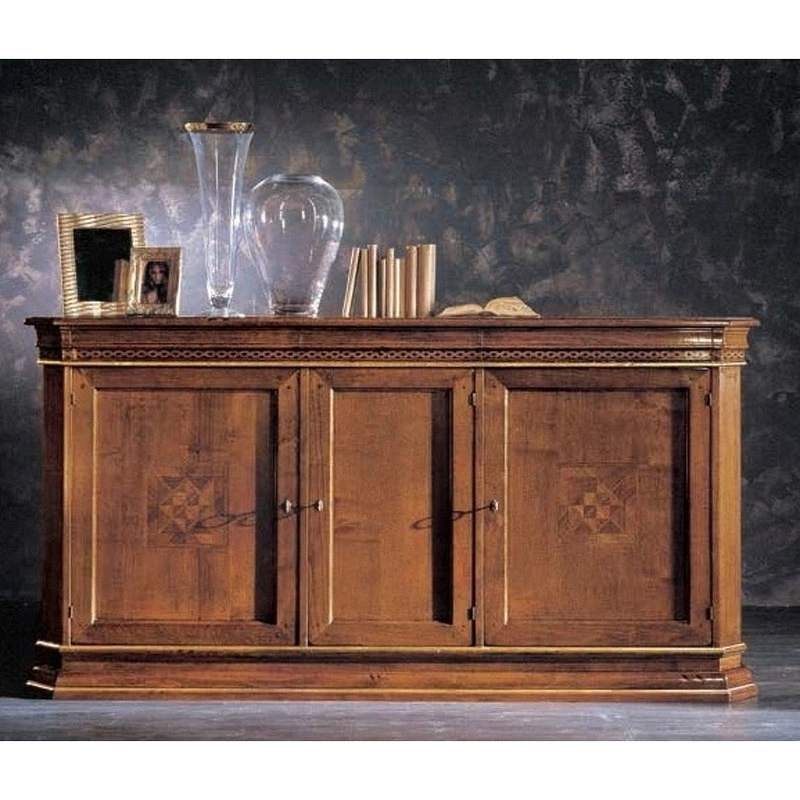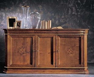 Буфет оформлен в классическом стиле и оборудован тремя дверцами. Резные элементы подчеркивают уникальность модели.