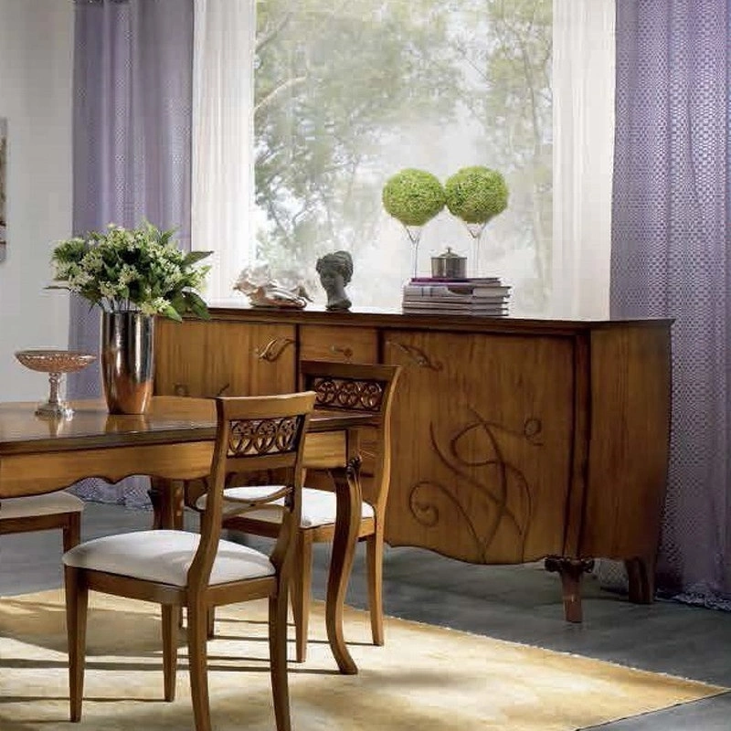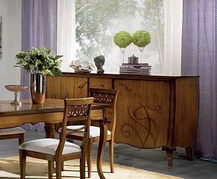 Буфет с изогнутыми резными ножками выполнен в классическом стиле. Он имеет две дверцы, а фасады украшены орнаментом.