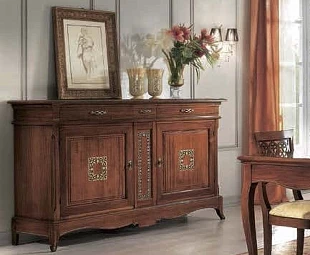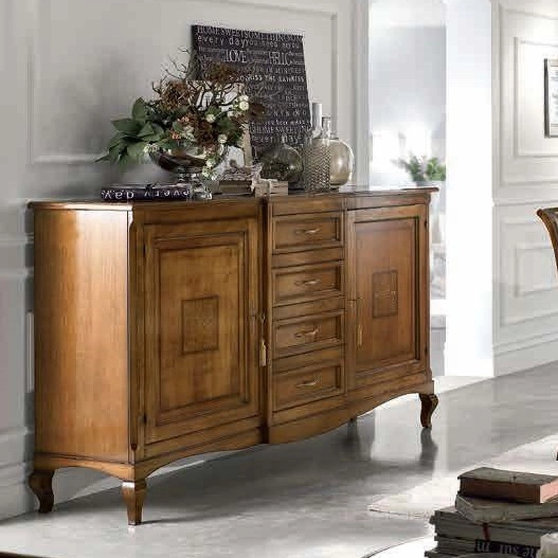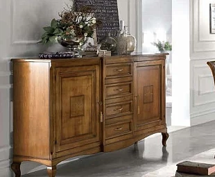 Буфет с изогнутыми ножками выполнен в классическом стиле. Он оснащен четырьмя ящиками и двумя дверцами с рельефными фасадными панелями.