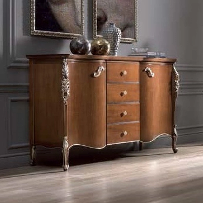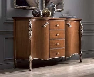 Буфет на изогнутых ножках в классическом стиле. У него четыре ящика и две дверцы. Декорирован резными элементами.