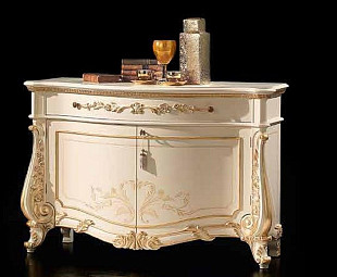 Имеет две створки и выдвижной ящик. Фасад богато украшен искусными декоративными элементами в виде цветов и листьев. Центр дверей оформлен интарсией из розового дерева- уникальной техникой ручной отделки, что подчеркивает всю роскошь и эксклюзивность мебели итальянских мастеров-краснодеревщиков.