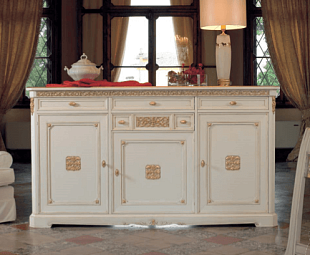 Буфет из массива дерева Белый Villa Venezia поражает своей красотой и изысканностью. Три отделения скрыты за распашными дверцами, вверху расположены пять выдвижных ящиков для мелких принадлежностей. При заказе данного предмета интерьера вы можете выбрать из нескольких вариантов оформление ножек, фасадов и узоров на них, скругленность поверхности. Светлый оттенок комода дополнен сусальным серебром или золотом на вам выбор.