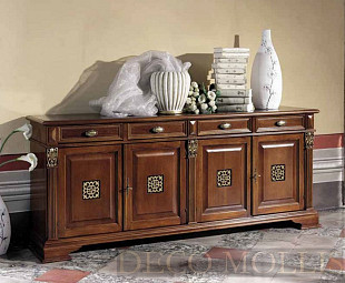 Буфет из массива Puccini фабрики Claudio Saoncella. Буфет выполнен в классическом стиле, итальянскими мастерами и дизайнерами. Буфет сделан из высококачественного массива и шпона, в цвете вишня с добавлением резьбы по дереву. Буфет имеет четыри двери и четыри выдвижных ящика.