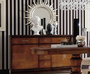 Элегантный буфет, выполненный в классическом стиле, в котором присутствует гармоничность, изысканность и уникальность. Нежные тона мебели прекрасно сочетаются с яркими элементами в виде элегантных ручек. Мебель покрыта высококачественным лаком, который защитит от старения, солнечного света и перепада температур. Мебель и отделка сделана из исключительно высококачественных материалов. Нестандартная форма мебели подчеркивает и придает индивидуальность всему интерьеру дома. Мебель выполнена в цвете мока с вишней. Роскошный итальянский буфет дополнит интерьер любого самого изысканного дома.