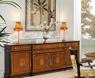 Шпон ясеня, самшита, ореха и палисандра, патина золото или серебро, лак.