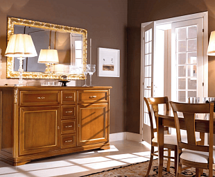 Буфет в гостиную Marco Polo поможет решить проблему хранения неиспользуемой посуды. Четыре небольших и два больших выдвижных ящика, а также ниши скрытые за распашными дверцами удачно разместят в себе все необходимое. Теплая и роскошная отделка в цвете "Орех" с декором сусальным золотом.