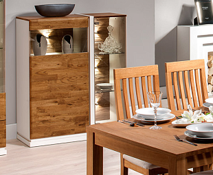 Буфет в гостиную Siena Taranko производится из массива дуба – фасадная часть, для изготовления корпусных панелей используется ДСП и МДФ, покрытые шпоном. Многообразие выбора предлагаемого фабрикой помогает подобрать наиболее подходящую мебель для обстановки комнаты.