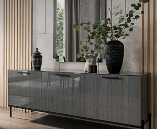 Шпон дерева, глянцевый лак, металлические элементы в черной отделке