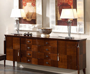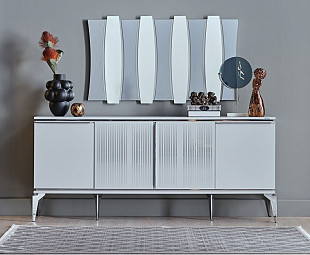 Буфет для гостиной Loretto является 4-дверным и изготовлен из качественного ЛДСП. Центральное отделение буфета имеет ящик для столовых приборов, что делает его удобным и практичным элементом мебели. Стеклянные дверцы с рисунком добавляют шарма и изысканности, а ножки выполнены в отделке хром.