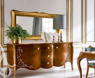 Буфет трехстворчатый от фирмы GIULIA CASA в цвете орех. Центральная створка представлена тремя выдвижными ящиками. По краям фасада располагаются узоры в виде деревянной резьбы. Ножки декорированы золотом.