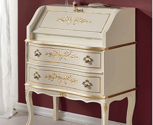 Секретер-бюро белое Classic Agostina изготовлено из массива бука в отделке шпоном ценных пород дерева. Легкая резьба в форме стилизованных листьев и цветов, а также окантовка покрыты сусальным золотом. Удивительно красивая, изящная и функциональная вещь. Для тонких ценителей Красоты.