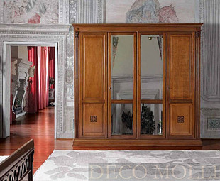 Четырехдверный шкаф с зеркалами Puccini фабрики Claudio Saoncella. Шкаф выполнен в классическом стиле, итальянскими мастерами и дизайнерами. Шкаф сделан из высококачественного массива и шпона, в цвете вишня с добавлением резьбы по дереву. Шкаф имеет четыри двери и два зеркала.
