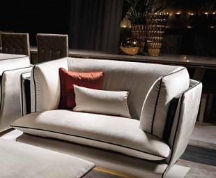 Цоколь с металлическим блестящим профилем, контрастный тканевый кант на кромках.
