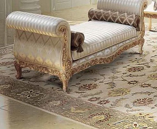 Диван-кушетка в классическом стиле от лучшей итальянской фабрики-производителя. Оригинальный дизайн и богатая отделка этой модели не оставит равнодушным даже самого искушенного покупателя. Обилие резных деталей, покрытых патинированным сусальным золотом, а так же дорогой текстиль - все это делает модель настоящим произведением искусства. Материалы и декор могут быть подобраны на вкус клиента.