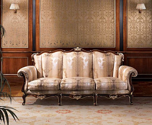 Большой трехместный диван из Италии в стиле "Барокко" станет шикарным приобретением, украсив собой дорогую, со вкусом обставленную гостиную. Комфортные, глубокие сиденья просто созданы для отдыха и покоя. Подлокотники в виде мягких валиков чуть откинуты в стороны для создания еще большего пространства. Обивка из премиальных тканей с эксклюзивным растительным орнаментом. Изящные резные детали украшают ножки, царги и спинку и покрыты слоем сусального золота. Все материалы и декор могут быть подобраны индивидуально.