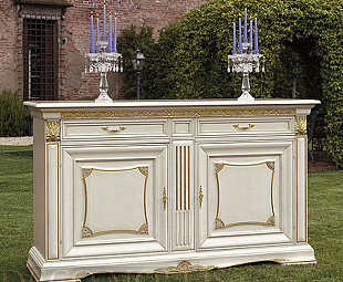Комод в гостиную для посуды классика Vivaldi изготовлен из массива ценных пород дерева в белом цвете. Карниз, дверцы и цоколь украшены изящной резьбой, покрытой золотой или серебряной фольгой.