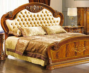 Классическая кровать Carmen от торговой марки Carvelli. Двуспальная кровать из массива березы и натурального шпона корня оливы, с инкрустацией, тонированный, цвет под тёмный орех медовый, лакированный. Мягкое и массивное изголовье украшено капитонами. Роскошная кровать дополнит интерьер вашей спальни.