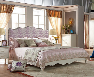 Двуспальная кровать из массива Carpenter 309 в цвете слоновая кость производится китайской мебельной фабрикой. Фигурная спинка модели по краям украшена кнопками-пуговицами.