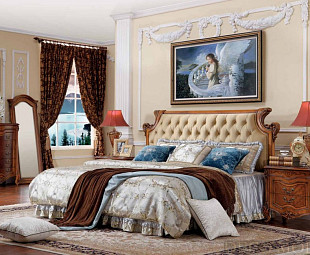 Двуспальная кровать коллекции Сarpenter 236. Классическая двуспальная кровать с высоким прямоугольным изголовьем удобна и практична. Кровать сделана из массива дерева в отделке цвета орех, с добавлением ручной лепки и в обивке из ткани. Роскошная кровать дополнит вашу спальню принеся уют и тепло.
