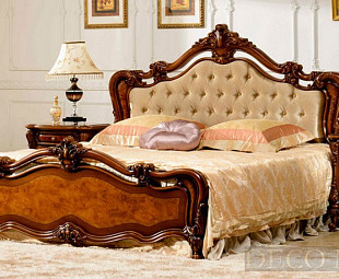 Кровать Маркиза. Двуспальная кровать с резным и мягким изголовьем, с добавлением ручной лепки. Кровать сделана из высококачественного мдф, с экологичным полимерным покрытием, в отделке цвета орех. Элегантная кровать отлично впишется в интерьер вашего дома.
