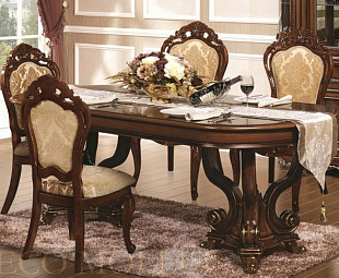 Мебельный гарнитур для столовой комнаты выполнен в классическом стиле позднего барокко. Добротно представлена текстура дерева благодаря применению натурального шпона в отделке. Резные растительные элементы ручного исполнения и гнутые ножки придают утонченный вид домашнему убранству. Сочетание изогнутых обводов буфета (витрины) с четкой геометрией круглого раздвижного стола, установленного на стилизованную под греческую колонну центральную стойку, равно как и прямыми линиями серванта и настенного зеркала, широкая прямоугольная рама которого обогащена резьбой, порождает буйство форм и задает эстетику семейного очага.
