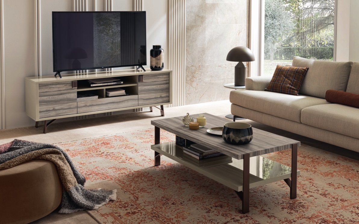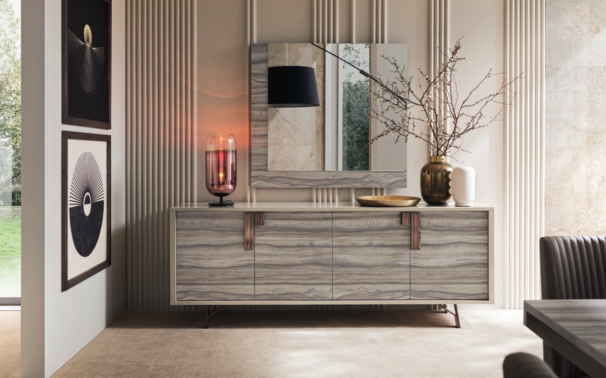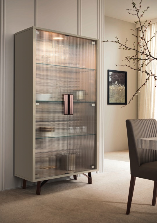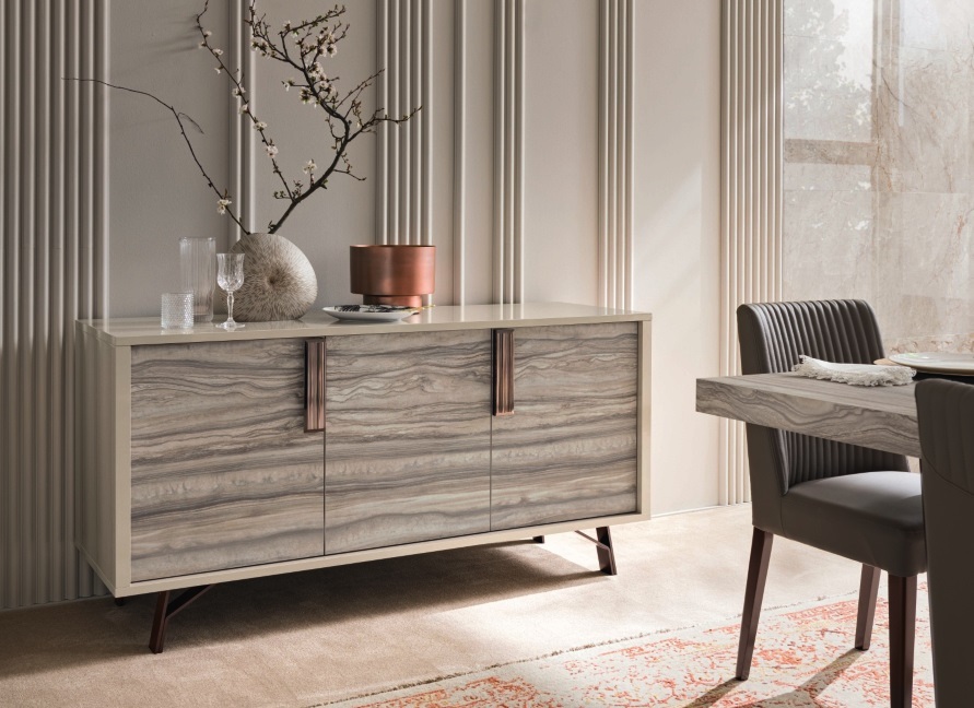 Отделка мебели имеет привлекательный контраст между глянцевым покрытием корпуса и матовой текстурой эко-камня на фасадах.