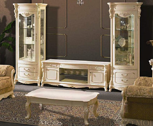 Мебель для гостиной коллекции Monro. Мебель коллекции выполнена в классическом стиле с добавлением ручной лепки. Каждый предмет коллекции Monro может стать украшением любого, даже самого изысканного интерьера. Гостиная сделана из массива березы, в отделке из натурального шпона корня оливы в белом цвете.