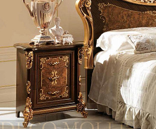Красивая и вместительная тумбочка прикроватная выполнена в классическом стиле, имеет три ящика, украшена резьбой, покрытой золочением, является элементом Спального гарнитура Sinfonia.