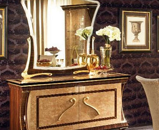 Итальянский буфет Rossini фабрики Arredo Classic. Буфет выполнен в классическом стиле лучшими итальянскими мастерами и дизайнерами. Буфет сделан из высококачественного МДФ и ДСП в цвете макассар, кофе с молоком, и украшен кристаллами Swarovski. Буфет имеет две дверцы.